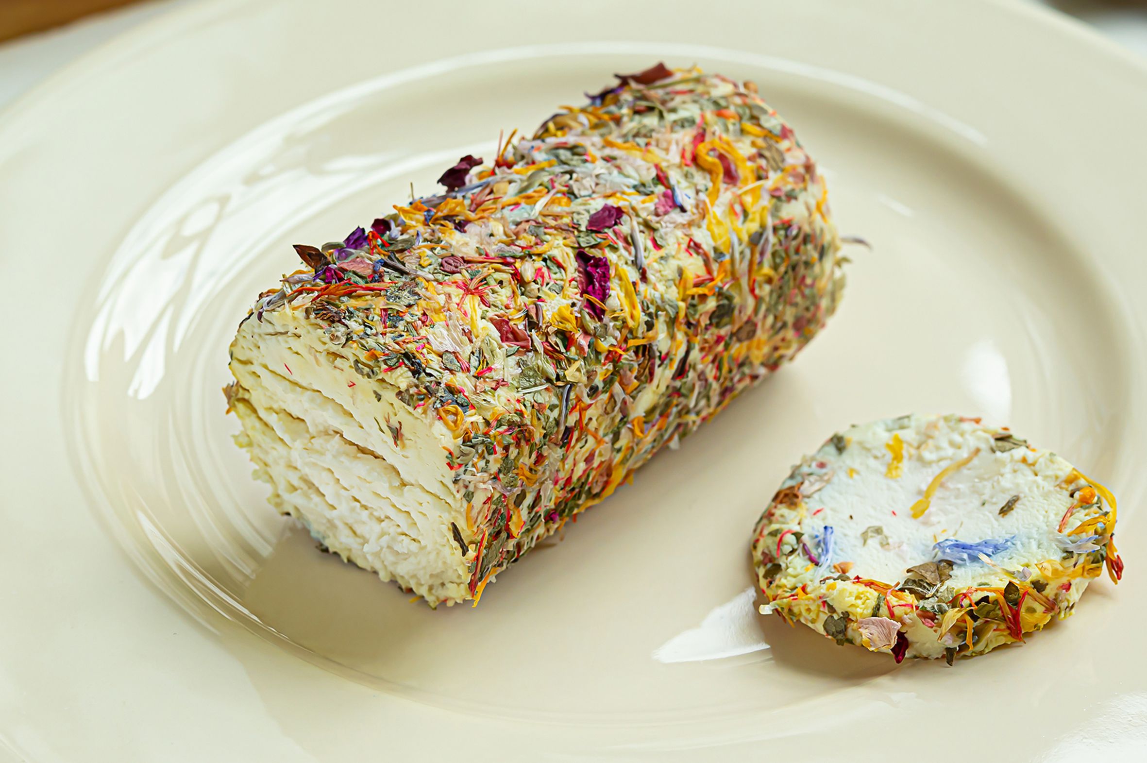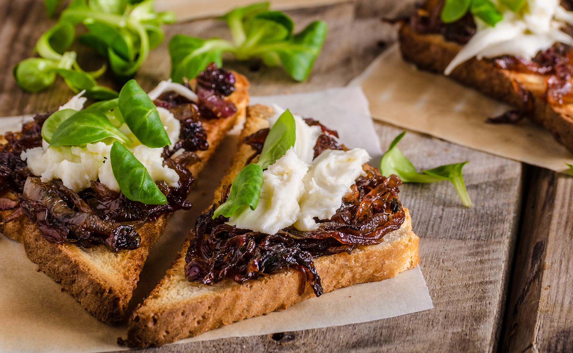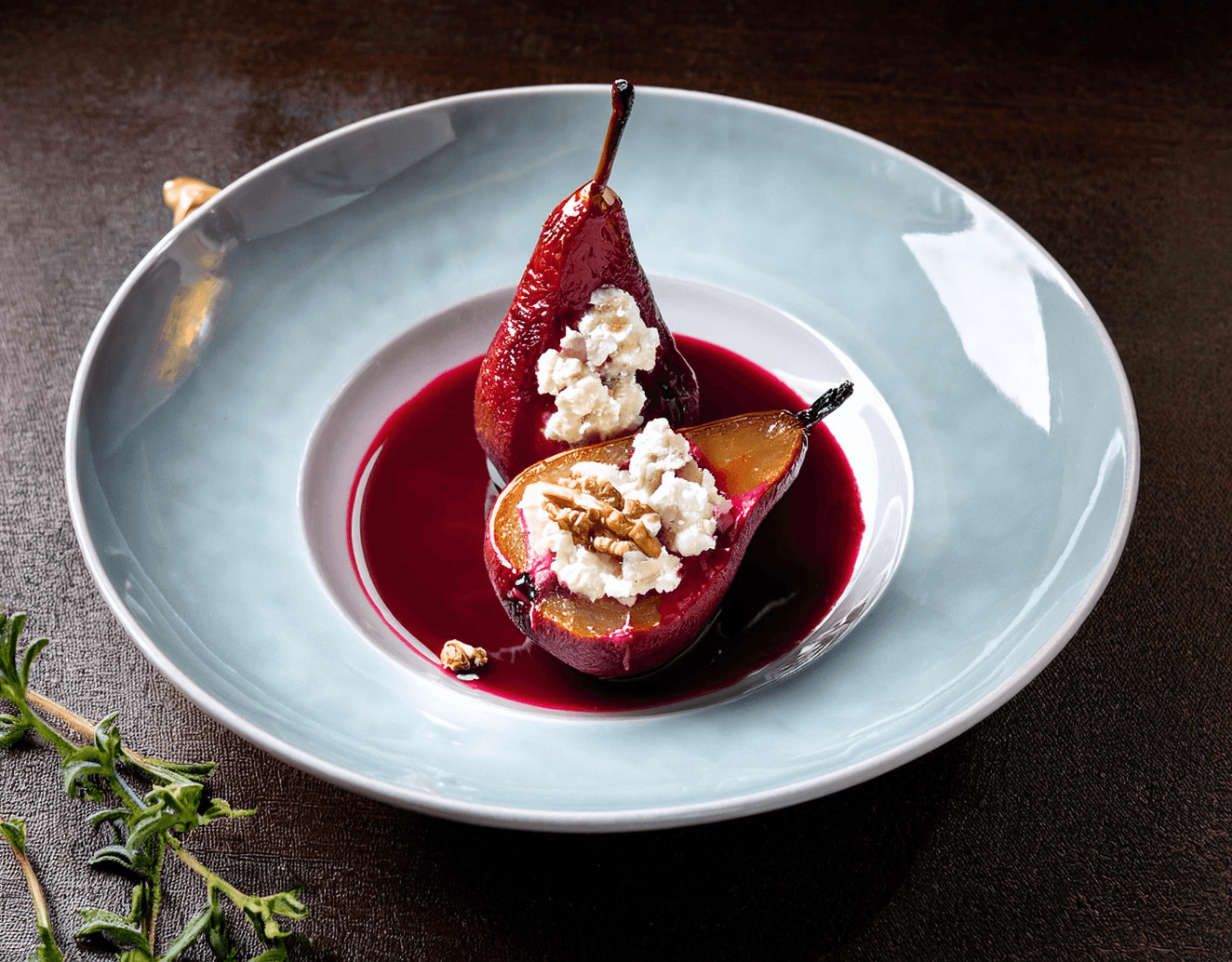 Disfruta la dulzura de las peras confitadas con la cremosidad del queso de cabra natural, bocado a bocado.